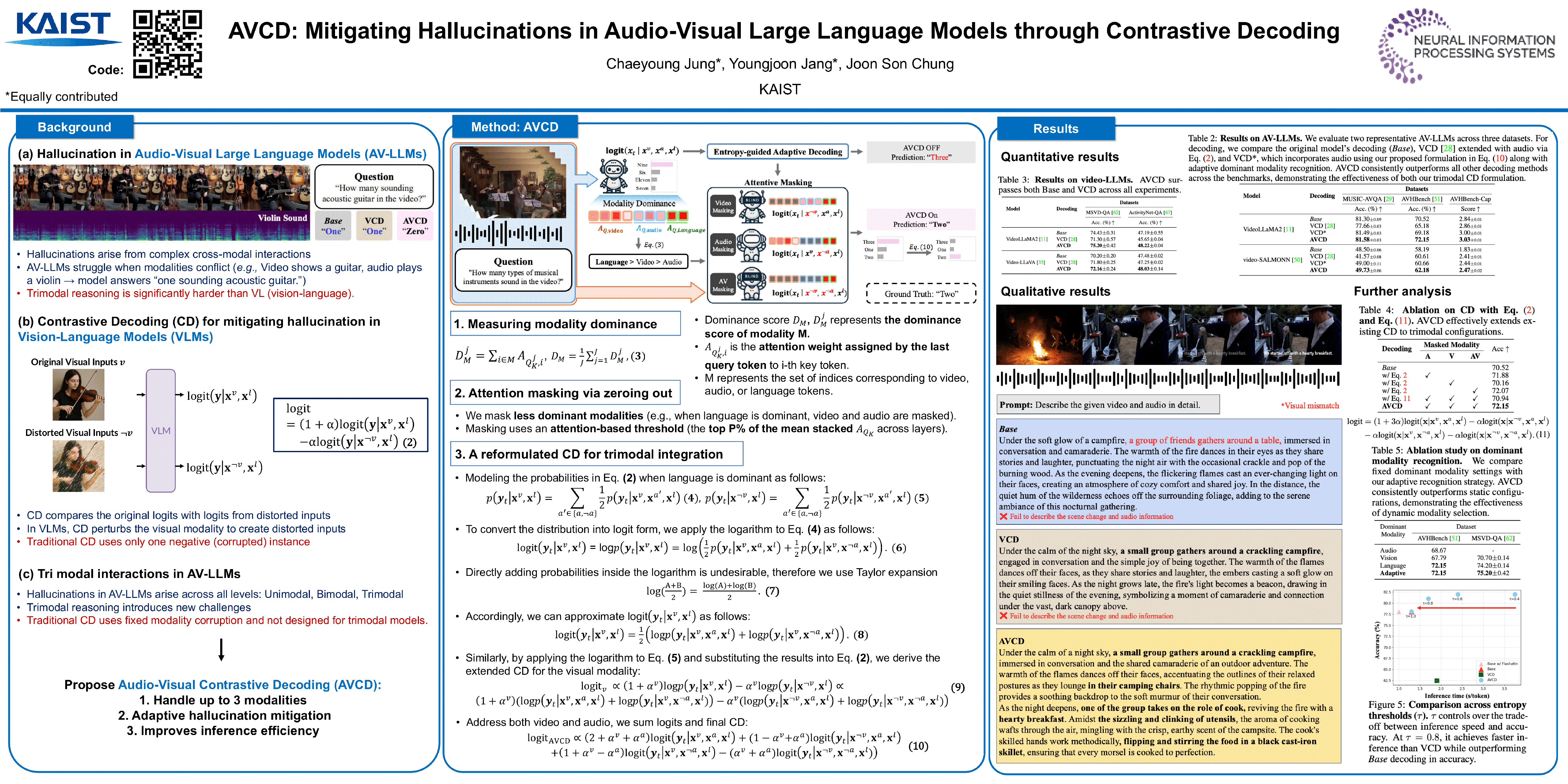 This paper proposes Audio-Visual Contrastive Decoding (AVCD), a training-free, inference-time method to reduce hallucinations in audio-visual LLMs by balancing how much the model relies on audio, video, and language.