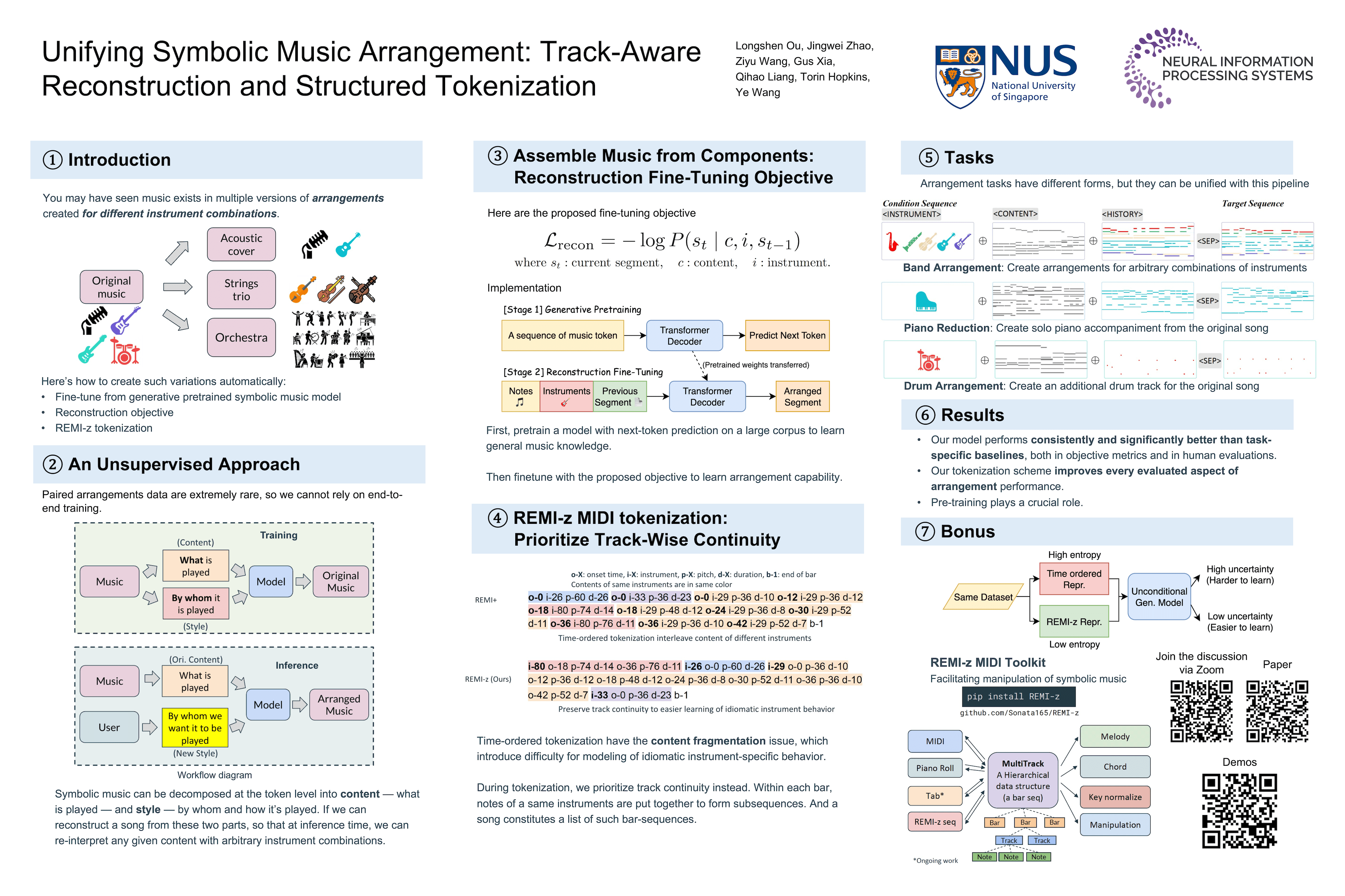 This paper proposes a unified method for automatic music arrangement using symbolic MIDI data. Instead of building separate models for different tasks (such as band arrangement, piano reduction, or drum arrangement), the authors show that all of them can be handled by one pre-trained symbolic music model through a shared reconstruction objective. The key idea is to explicitly separate musical content (notes and timing) from instrumentation (which instrument plays what), and train the model to reconstruct target tracks from these components without requiring parallel arrangement datasets. To make this work effectively, the paper introduces REMI-z, a new MIDI tokenization scheme that preserves track-wise continuity and improves instrument control. Experiments show that this approach outperforms task-specific baselines across multiple arrangement scenarios, demonstrating that careful objective design and tokenization are enough to unlock flexible, general-purpose symbolic music arrangement.