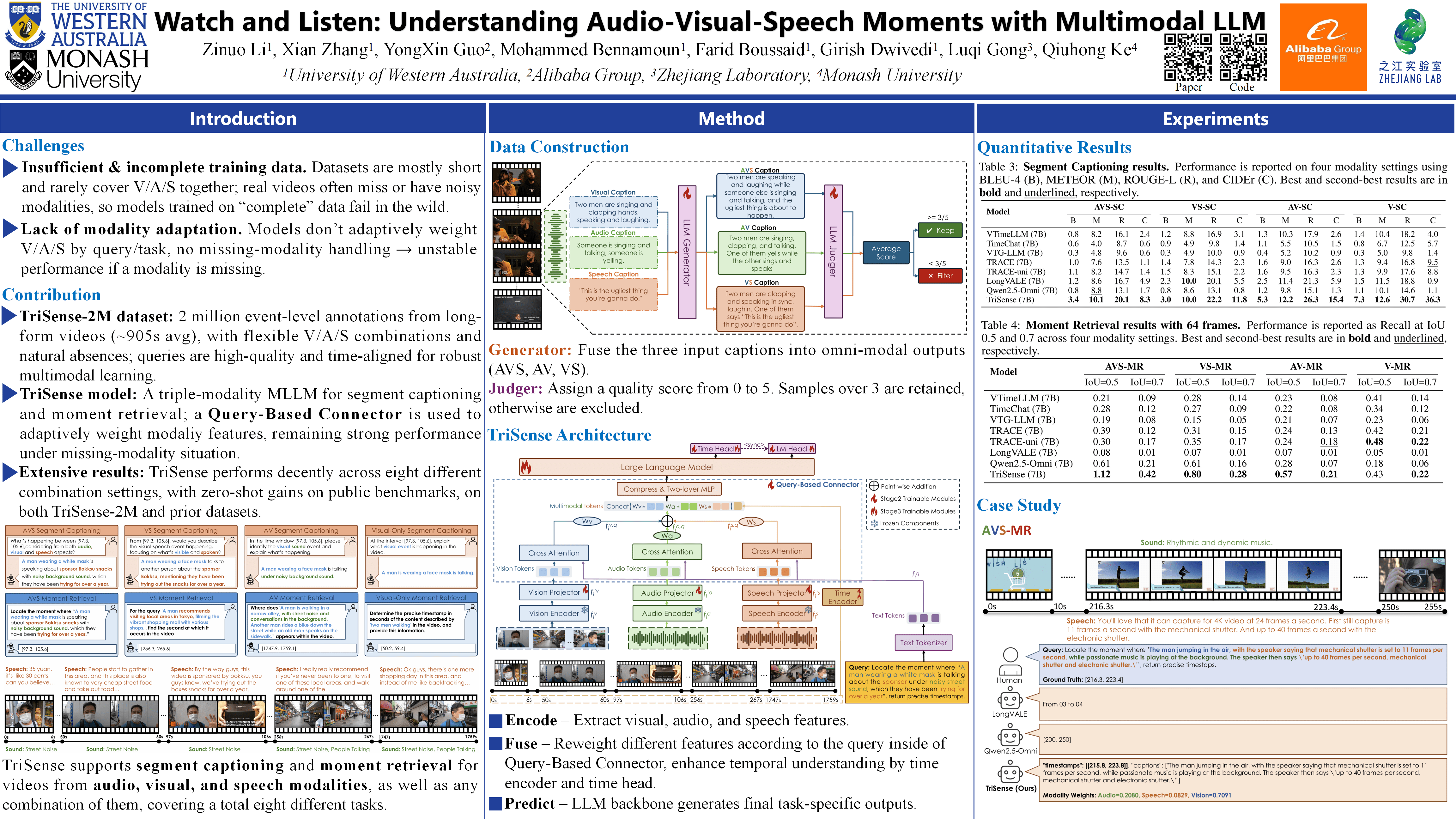 TriSense makes several contributions that are directly useful for practical systems. First, the query-based modality weighting is a concrete and reusable idea: instead of always fusing vision, audio, and speech equally, the model learns to emphasize the modalities that actually matter for a given query, which is highly relevant for real-world media where audio may be noisy, missing, or more important than visuals. Second, TriSense-2M is valuable not just for scale, but for how it is built: long videos, explicit audio–visual–speech alignment, and systematic coverage of modality dropout, which better matches real production content than short, clean clips. Third, the task setup—moment retrieval and segment captioning under different modality combinations—is a realistic evaluation framework that can be reused to test multimodal systems beyond vision-only baselines. Overall, the paper contributes usable design patterns (adaptive fusion), usable data construction strategies (LLM-based multimodal annotation with quality control), and a benchmark setting that aligns well with real audio-visual pipelines rather than idealized lab conditions.